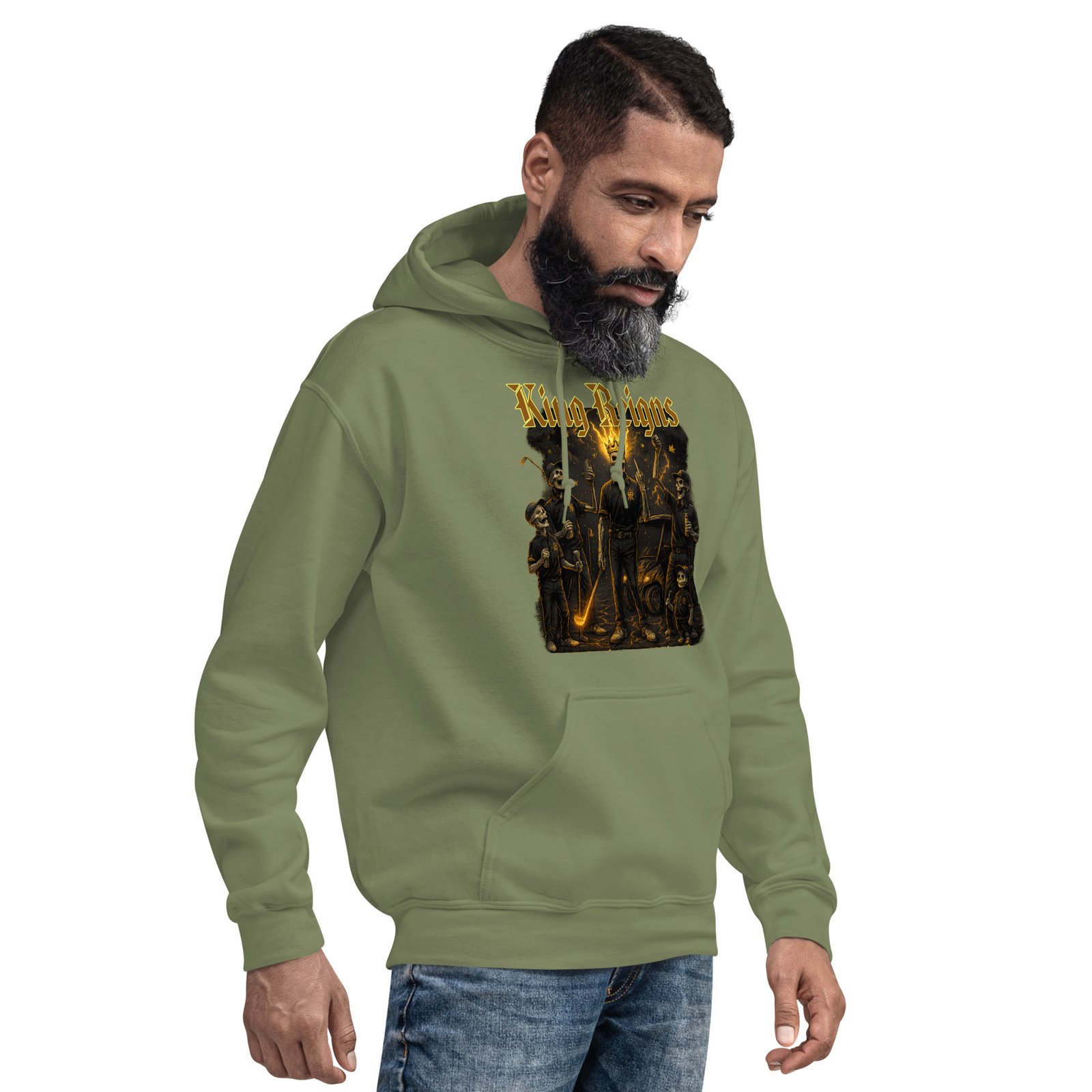 Rule the streets and the seasons with this heavyweight King Reigns hoodie — where royal rebellion meets street legend status. The bold front graphic showcases four skeletal icons posted up at the 18th hole, surrounded by fire-lit energy, golf clubs, and a tricked-out cart. At the center stands the crowned King, glowing gold and flipping the finger — a symbol of power, unity, and fearless dominance. A young skeleton golfer beside him nods to legacy and lineage.