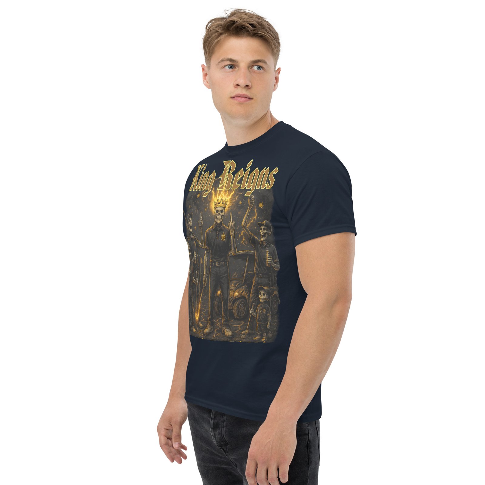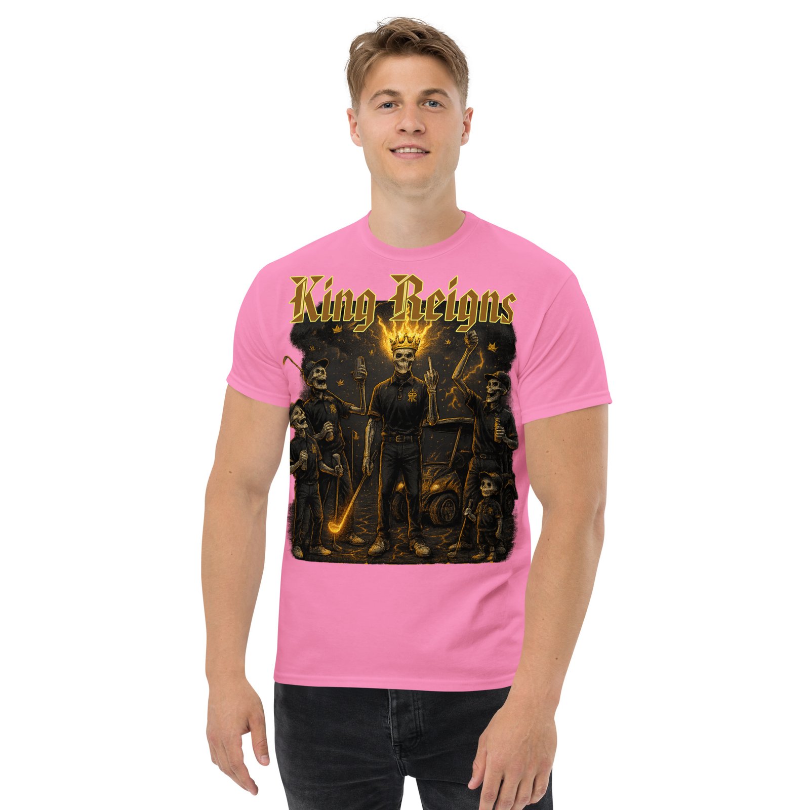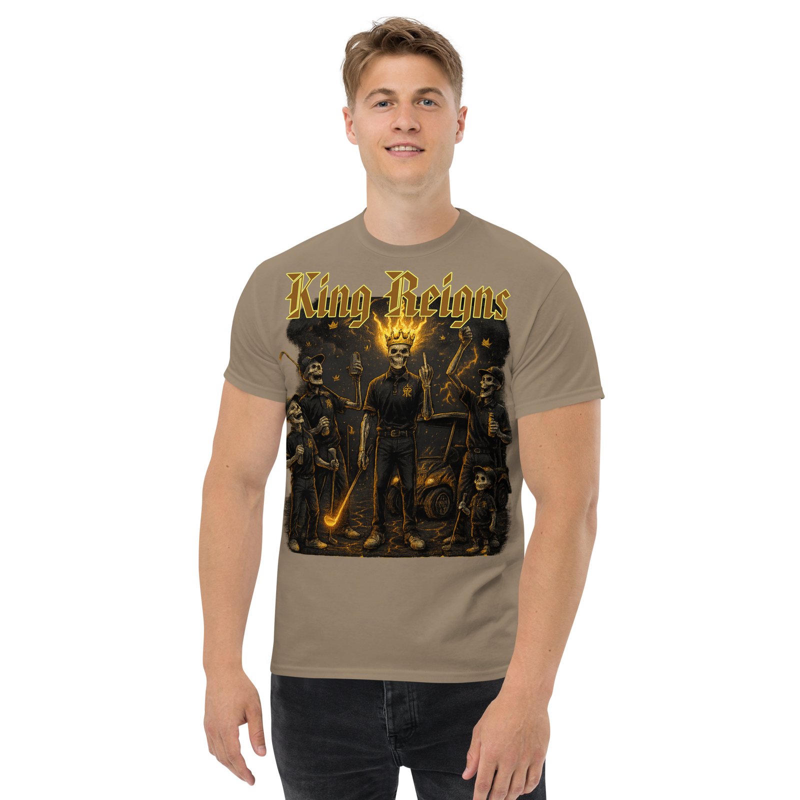 Step into royalty with this standout graphic tee, featuring the bold and rebellious King Reigns artwork — a graphic tribute to brotherhood, victory, and streetwear dominance. With four skeleton legends gathered at the 18th hole, flames rising, and gothic gold lettering crowning the scene, this graphic tee is pure energy.