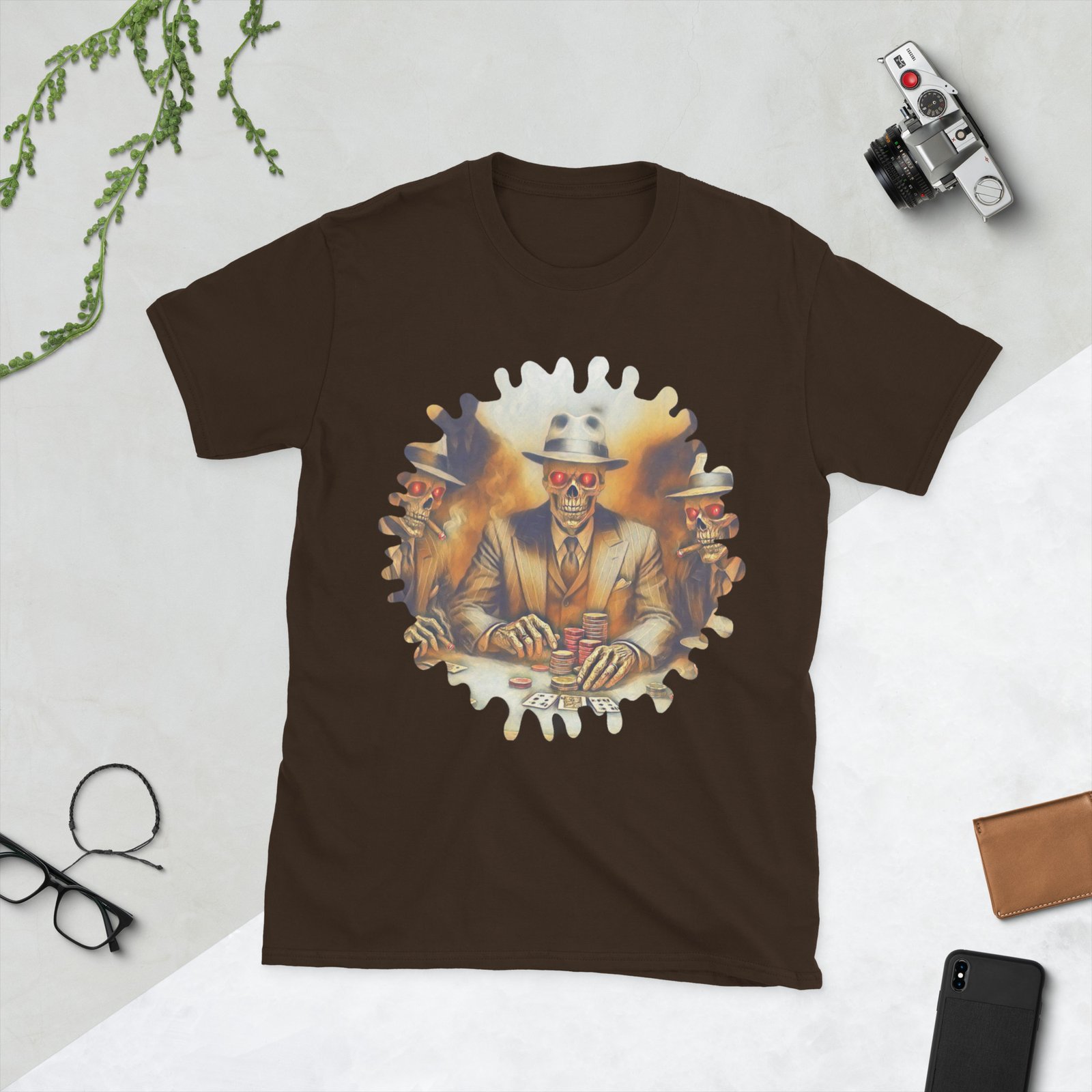 Make a statement with this surreal and stylish tee featuring a fiery-eyed mafia skeleton crew locked in a high-stakes poker game. The design bursts from the center in a jagged ink-blot frame that pops against the black background — perfect for streetwear, collectors, or anyone who vibes with dark art and gritty glam.