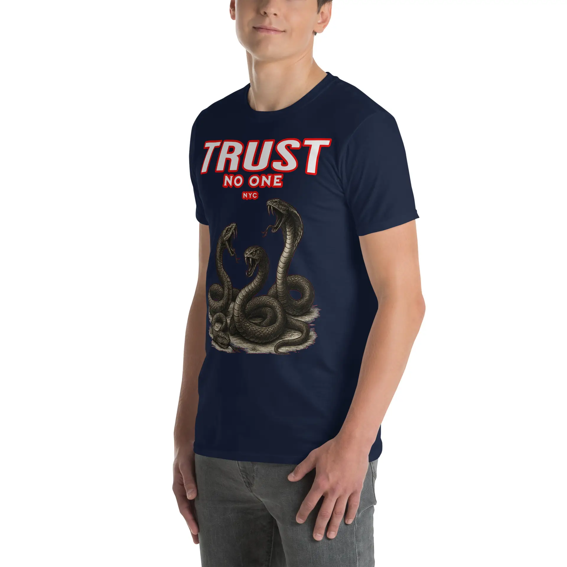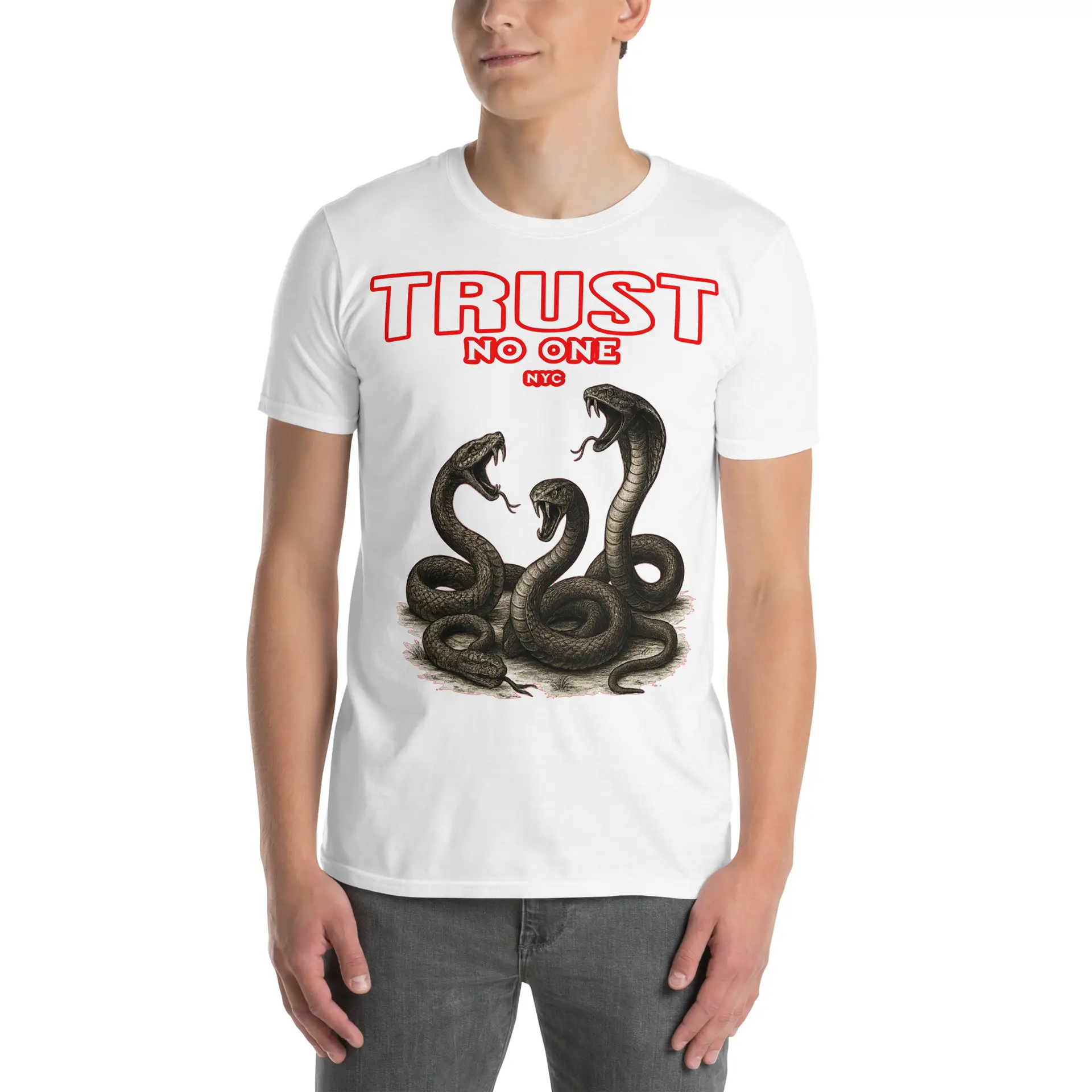 The front features the bold TRUST NO ONE statement, crowned with presence and reinforced by the three serpent emblem. The imagery represents awareness, strength, and calculated movement. This is a reminder that kings protect their circle and choose their alliances wisely.