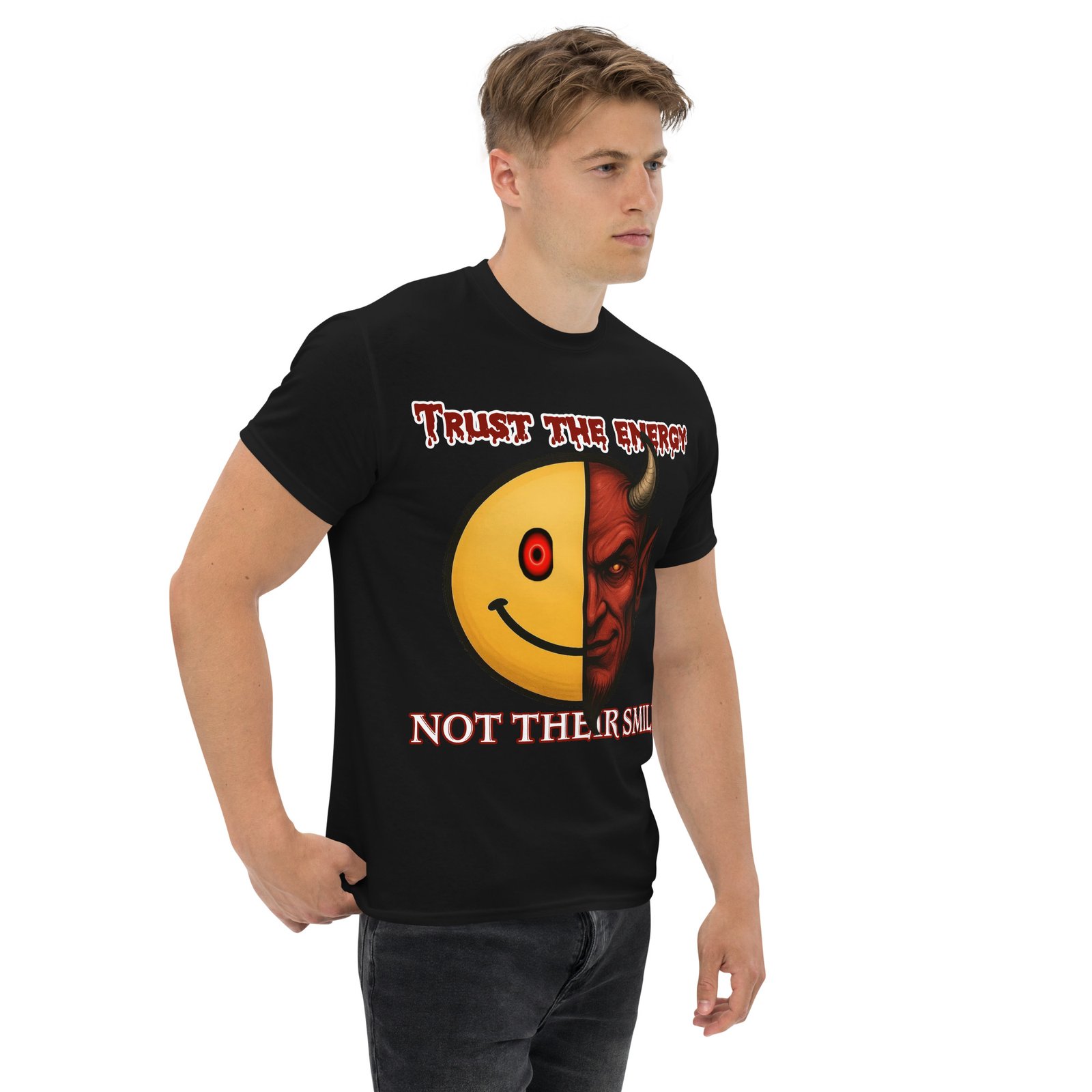 This powerful graphic tee makes a statement before you even speak. Featuring a split face—half cheerful emoji, half devil with a glowing red eye—this shirt reminds you to trust the vibe, not the mask. Gothic-style red lettering drives the message home: “Trust the Energy, Not Their Smile.” A must-have for the sharp-eyed and spiritually alert.